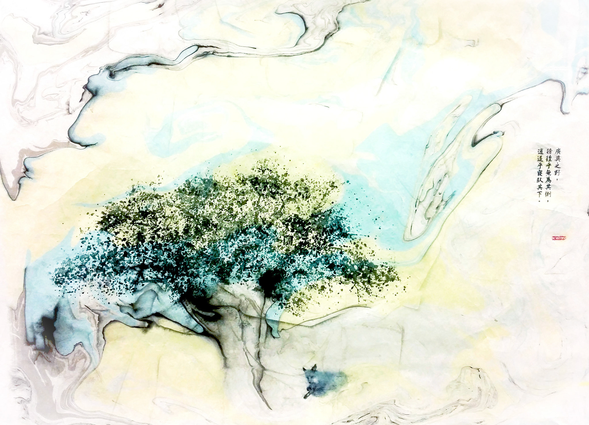 這是用大理石花紋繪畫和拼貼設計而成的圖像。 由於我喜歡中國傳統文化,這作品表達了中國哲學中的道家思想。 This is an image design created by paper marbling and collage. As I like traditional Chinese culture, this work expresses the Chinese philosophy which is Taoism.