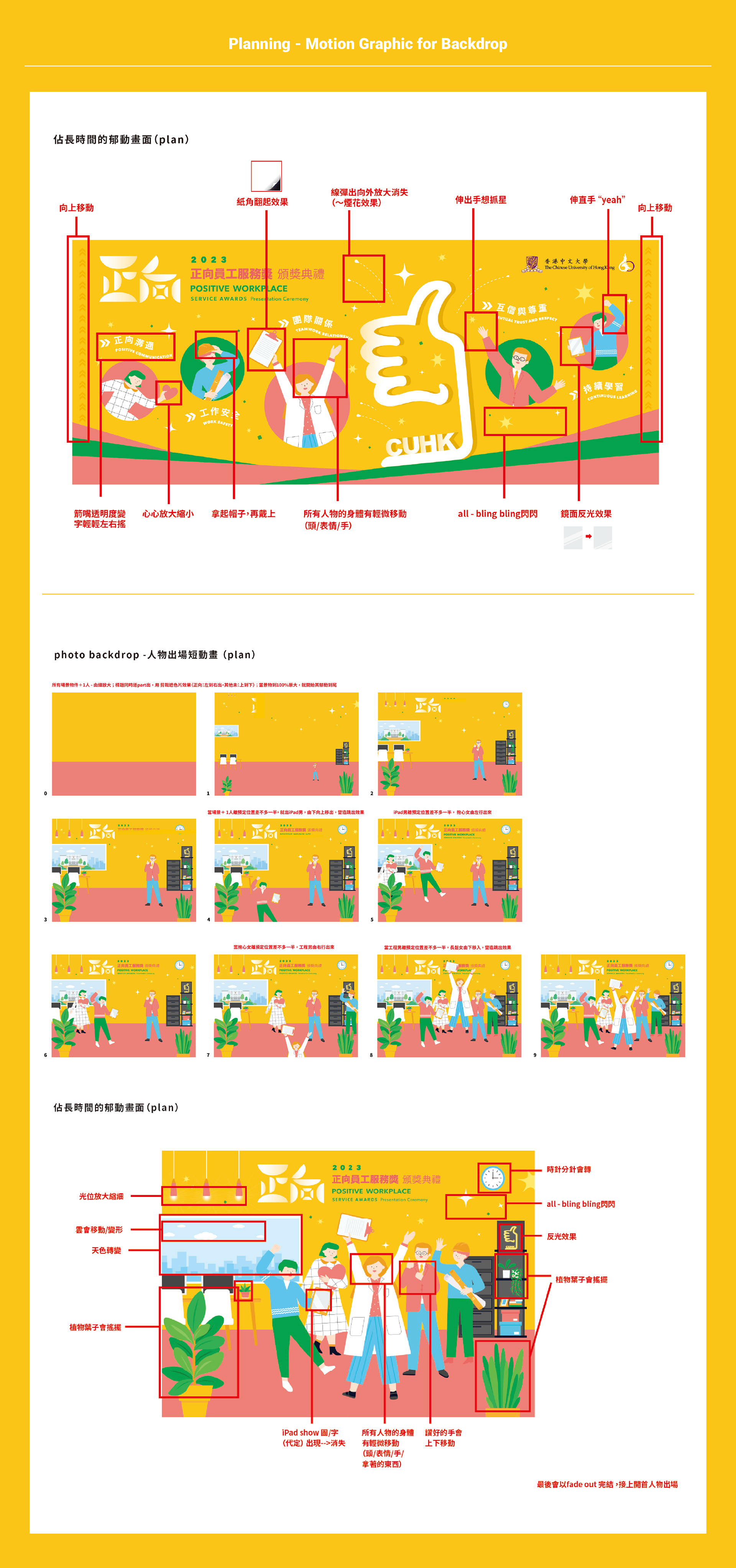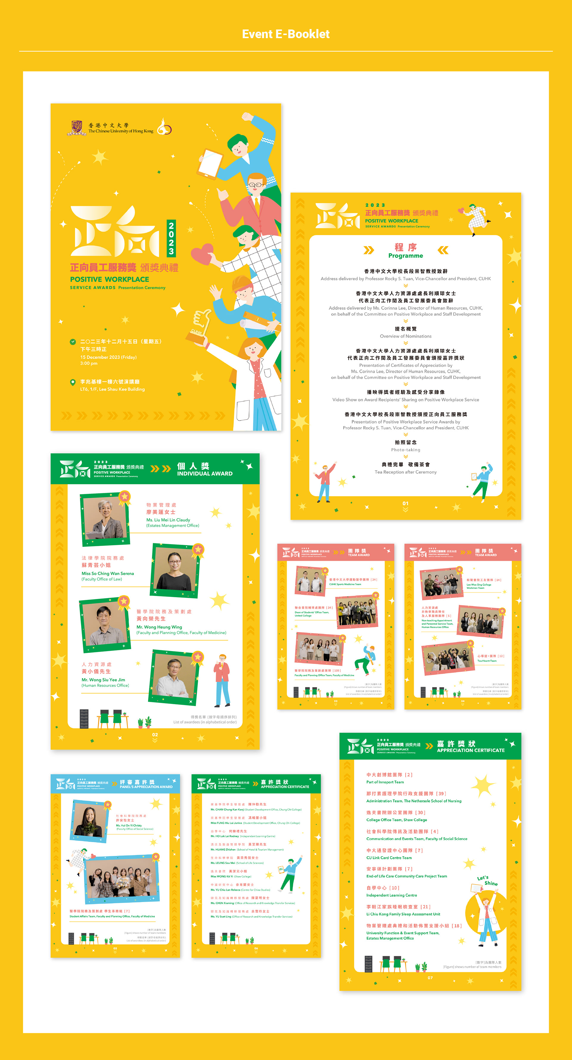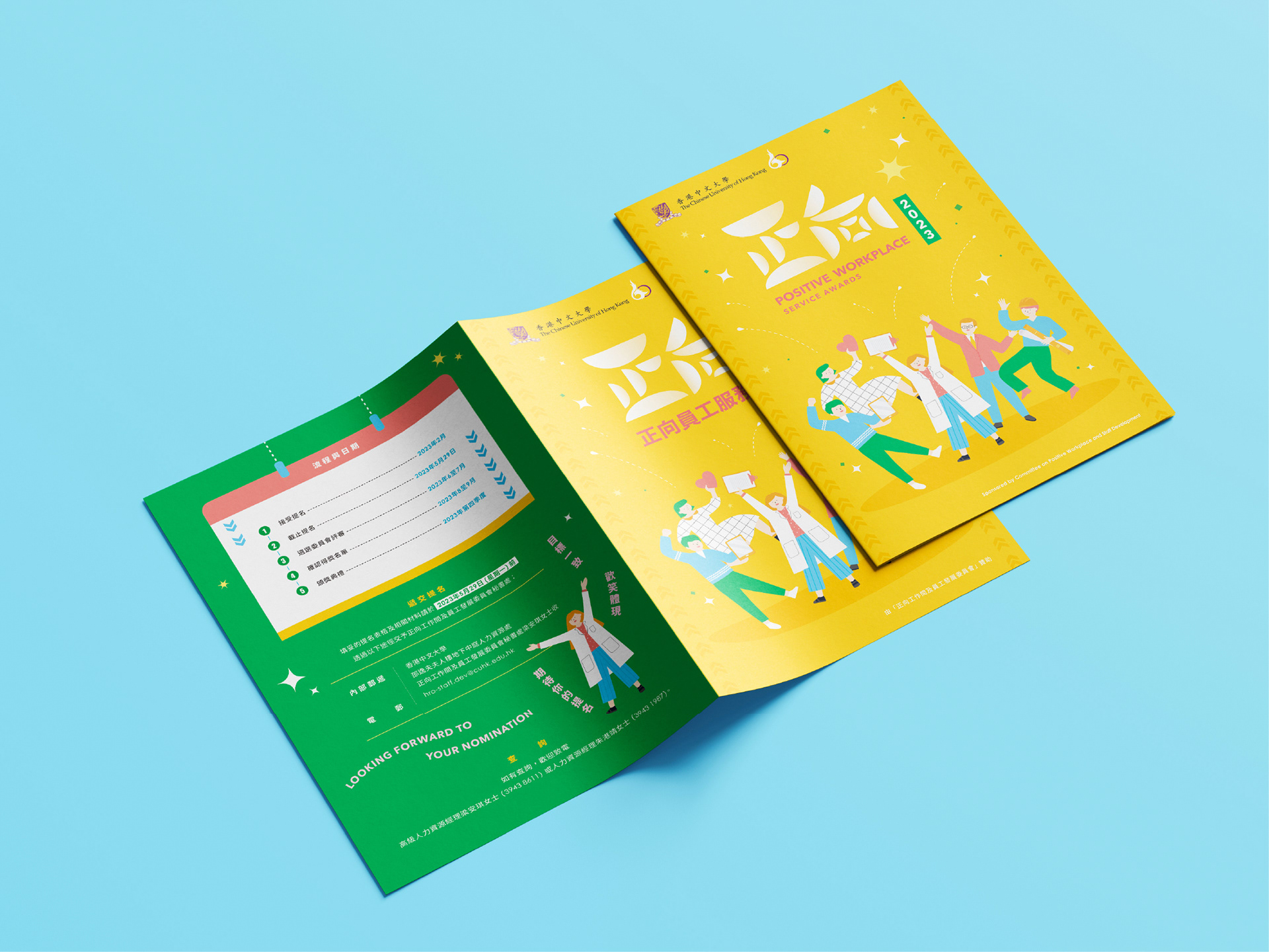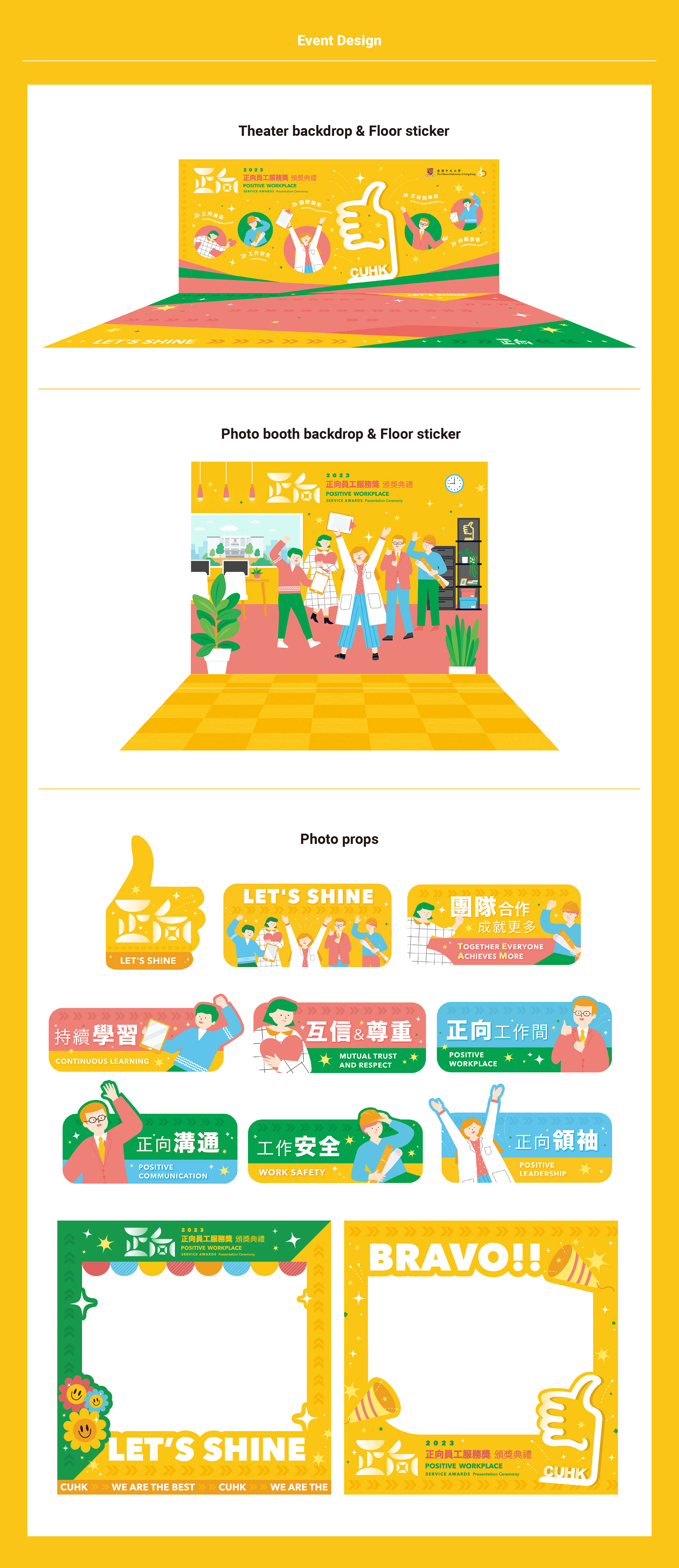 以不同岡位的人物,其開心的姿勢為主視覺,配以主明亮大膽的顏色,加上細微的閃亮裝飾圖案,帶出正向喜悅的感覺。 The main visual is the happy postures of staff, with bright and bold colors and shiny decorative graphics, bringing out a positive and joyful feeling.